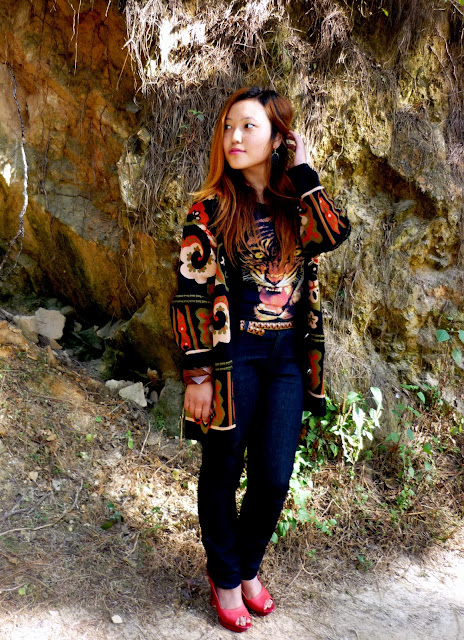I was totally captivated by it's beautiful hills, woods along with it's scenery riches with full of evergreen beauty. It was as just as i was laying in the arms of the nature. It was utterly amazing. So, here I am with my another post where I tried my best to relate the topic and of course the outfit with each other very well. Okay i preferred to wear dark color rather than those brightful one. Well the outer I'm wearing is actually my mom's! Ha ha! This was brought by my dad when i was child and I am amazed that she still have it. I love the prints on it so much that I decided to wear it along with the tiger print T-shirts which I got last time when my dad came back from Bangkok. Teamed it up with black jeans and red heels to emphasized on it. For the accessories, I'm wearing wooden bangles! And I got this as a gift from my dearest friend when she came from India. Here it goes ♥